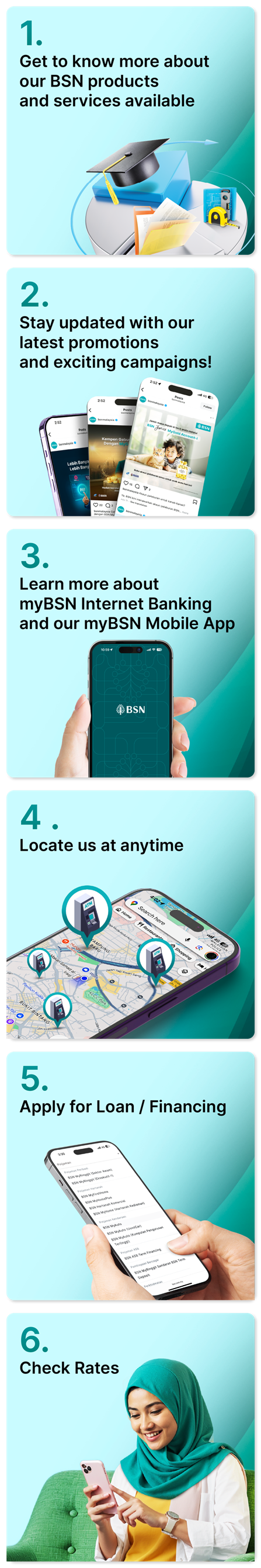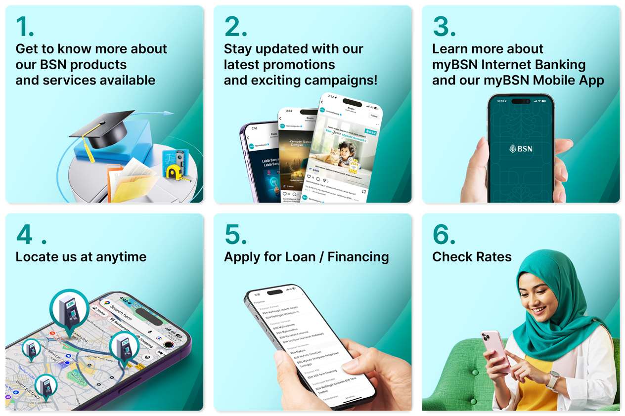 Through BSN WhatsApp Banking, you can conveniently access information on BSN products and services, view the latest campaigns or promotions, locate branches or ATMs, make general inquiries, and more – all at your fingertips.