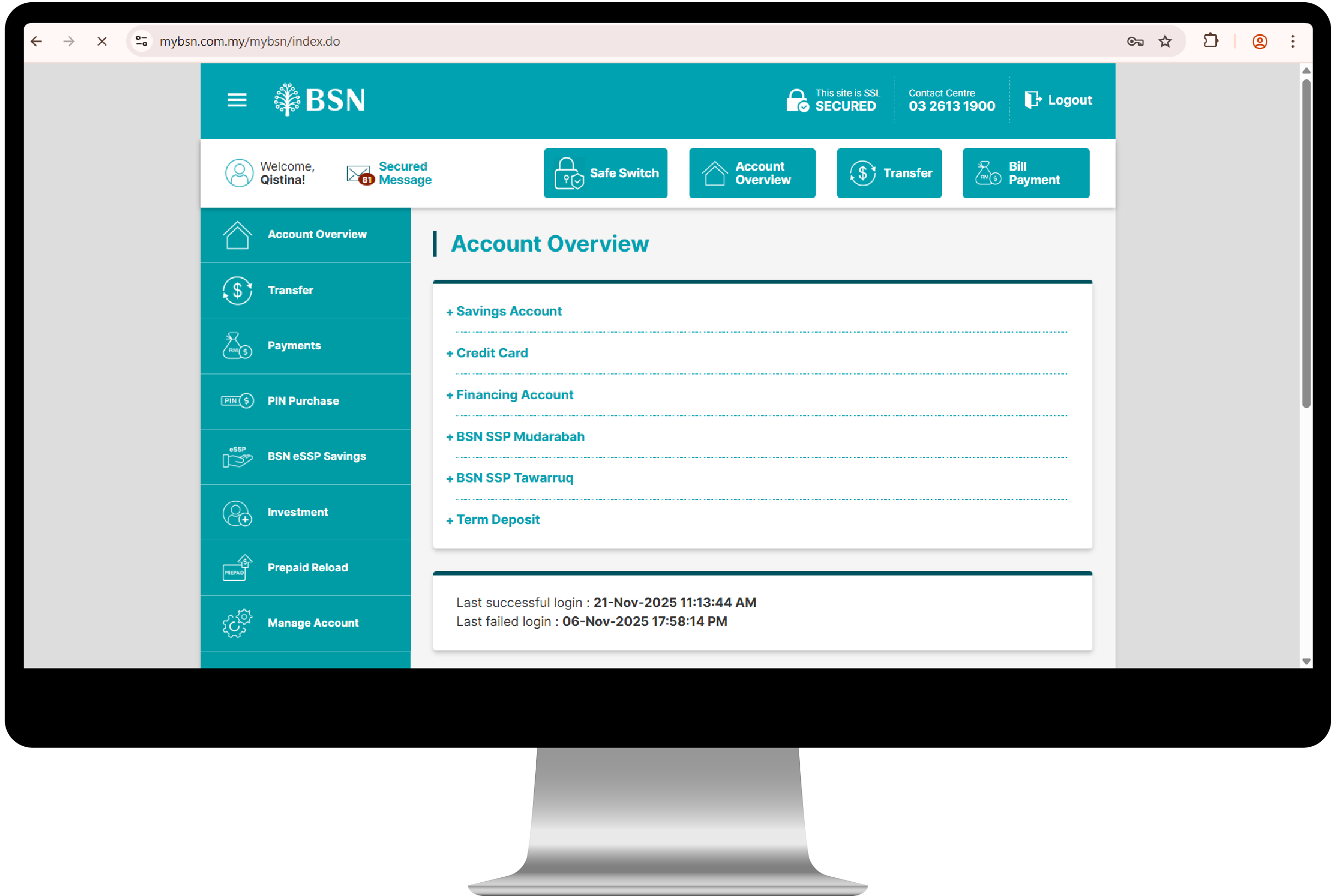 Log masuk ke akaun BSN anda melalui Perbankan Internet myBSN menggunakan ID pengguna dan kata laluan berdaftar anda.