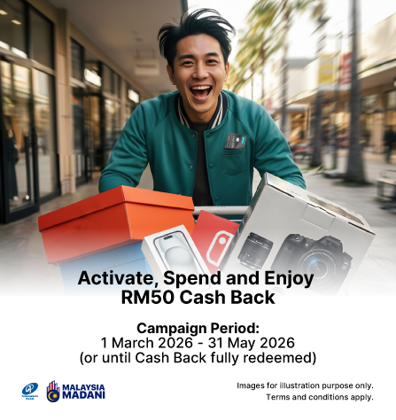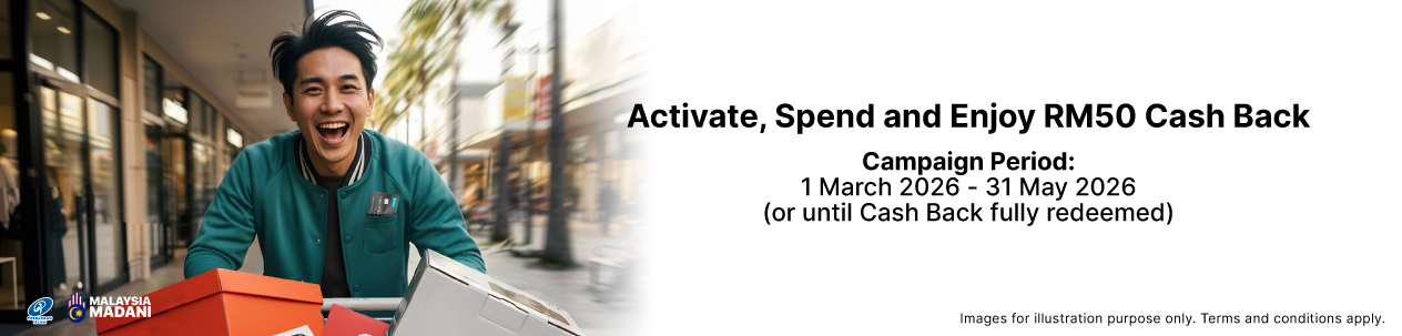 - Cash Back Reward is subject to successful card activation and minimum one (1) retail spend of RM100 in a single receipt during the Campaign Period.