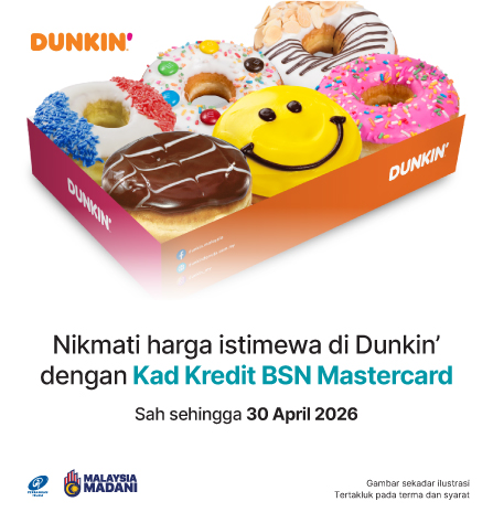 Nikmati setiap saat yang menggembirakan bersama Dunkin’ dengan Kad Kredit BSN Mastercard dan nikmati harga Istimewa!
