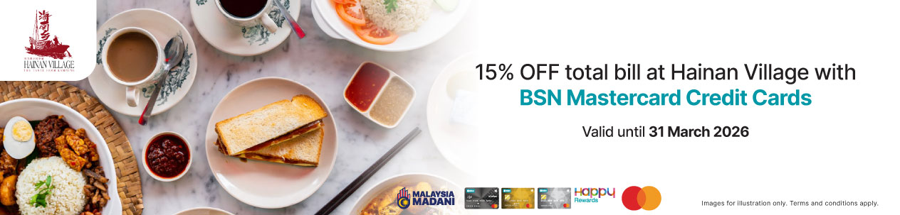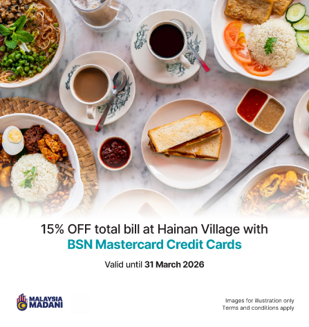 Enjoy 15% OFF total bill with a minimum spend of RM30 in a single receipt with BSN Mastercard Credit Cards. |