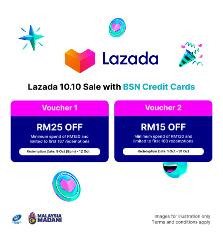 Voucher 2: Enjoy RM15 OFF with a minimum spend of RM120 with BSN Credit Cards, Limited to 100 redemptions.